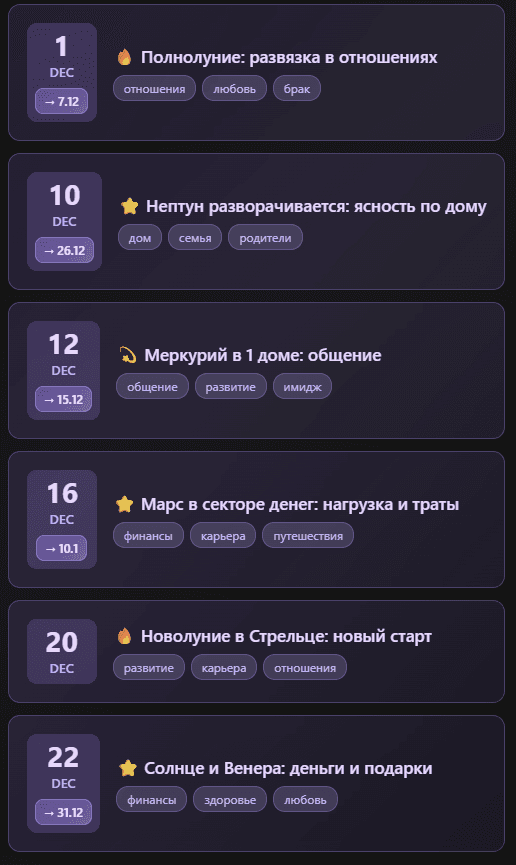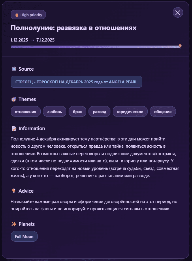 Add videos from astrologers you follow. We extract all the important dates they mention.