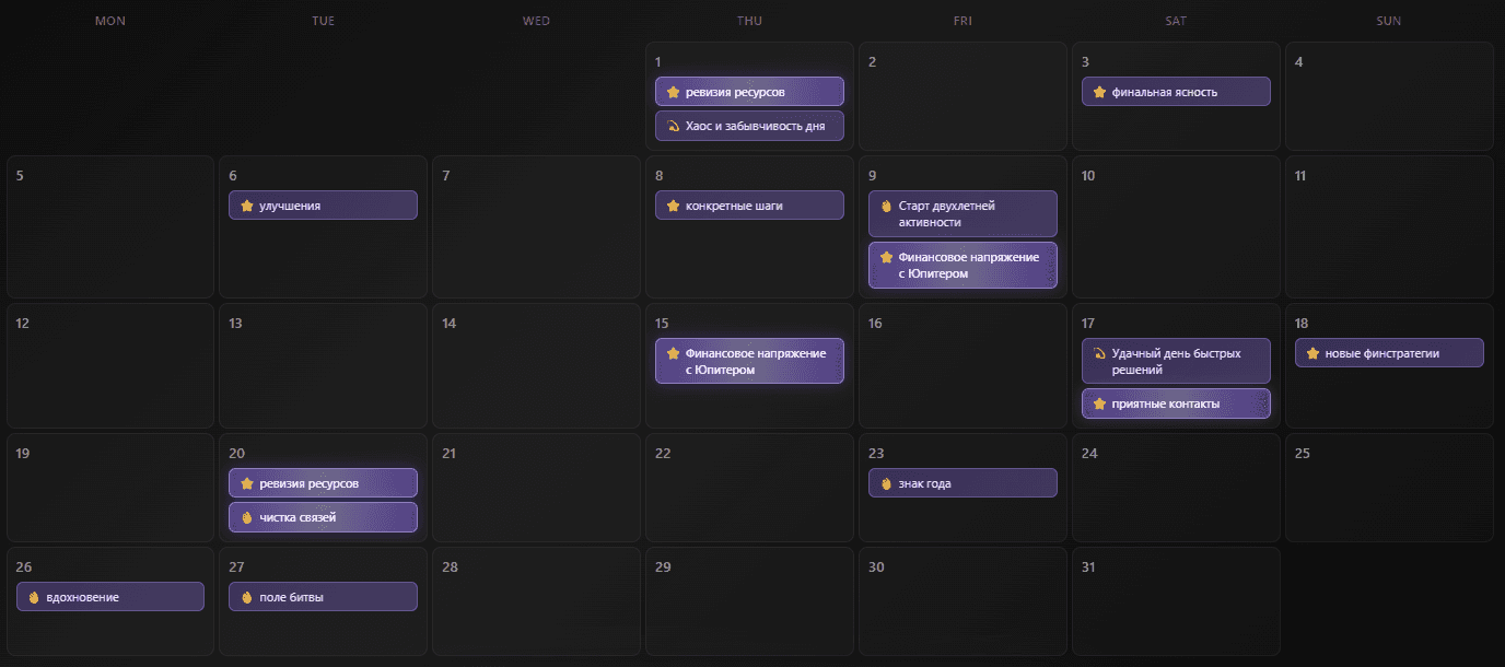 See the whole month at a glance. Perfect for planning around major transits and void-of-course moons.